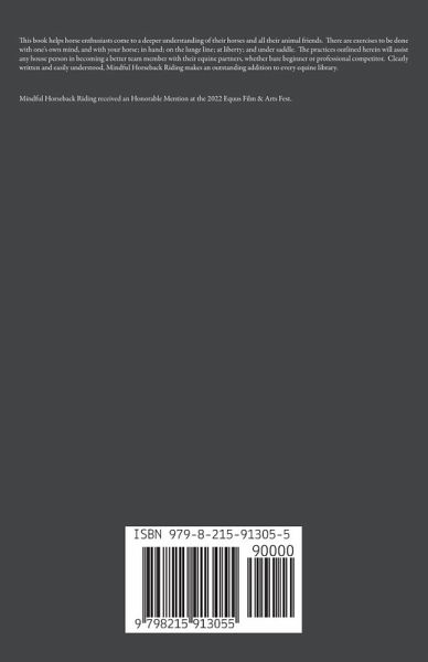 This book helps horse enthusiasts come to a deeper understanding of their horses and all their animal friends. There are exercises to be done with one's own mind, and with your horse; in hand; on the lunge line; at liberty; and under saddle. The practices outlined herein will assist any house person in becoming a better team member with their equine partners, whether bare beginner or professional competitor. Clearly written and easily understood, Mindful Horseback Riding makes an outstanding addition to every equine library. Mindful Horseback Riding received an Honorable Mention at the 2022 Equus Film & Arts Fest.