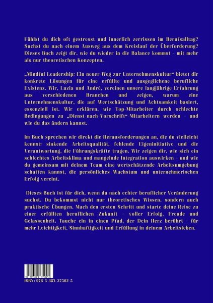 "Mindful Leadership: Ein neuer Weg zur Unternehmenskultur" bietet Dir konkrete Lösungen für eine erfüllte und ausgeglichene berufliche Existenz. Wir, Luzia und André, vereinen unsere langjährige Erfahrung aus verschiedenen Branchen und zeigen, warum eine Unternehmenskultur, die auf Wertschätzung und Achtsamkeit basiert, essenziell ist. Wir erklären, wie Top-Mitarbeiter durch schlechte Bedingungen zu "Dienst-nach-Vorschrift"-Mitarbeitern werden - und wie Du das ändern kannst.Im Buch sprechen wir direkt die Herausforderungen an, die Du vielleicht kennst: sinkende Arbeitsqualität, fehlende Eigeninitiative und die Verantwortung, die Führungskräfte tragen. Wir zeigen Dir, wie sich ein schlechtes Arbeitsklima und mangelnde Integration auswirken - und wie Du gemeinsam mit Deinem Team eine wertschätzende Arbeitsumgebung schaffen kannst, die persönliches Wachstum und unternehmerischen Erfolg vereint.