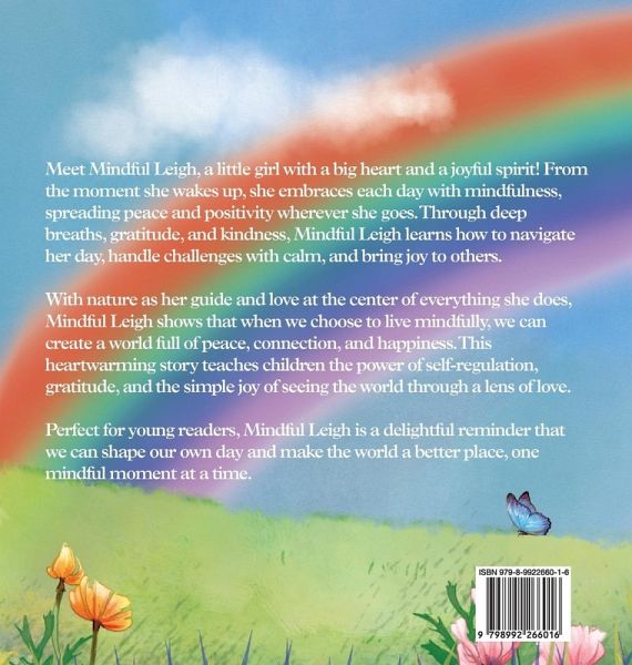 Meet Mindful Leigh, a little girl with a big heart and a joyful spirit! From the moment she wakes up, she embraces each day with mindfulness, spreading peace and positivity wherever she goes. Through deep breaths, gratitude, and kindness, Mindful Leigh learns how to navigate her day, handle challenges with calm, and bring joy to others. With nature as her guide and love at the center of everything she does, Mindful Leigh shows that when we choose to live mindfully, we can create a world full of peace, connection, and happiness. This heartwarming story teaches children the power of self-regulation, gratitude, and the simple joy of seeing the world through a lens of love. Perfect for young readers, Mindful Leigh is a delightful reminder that we can shape our own day and make the world a better place, one mindful moment at a time.