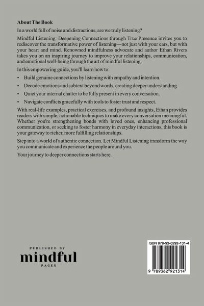 In a world full of noise and distractions, are we truly listening? Mindful Listening: Deepening Connections through True Presence invites you to rediscover the transformative power of listening-not just with your ears, but with your heart and mind. Renowned mindfulness advocate and author Ethan Rivers takes you on an inspiring journey to improve your relationships, communication, and emotional well-being through the art of mindful listening. In this empowering guide, you'll learn how to:Build genuine connections by listening with empathy and intention. Decode emotions and subtext beyond words, creating deeper understanding. Quiet your internal chatter to be fully present in every conversation. Navigate conflicts gracefully with tools to foster trust and respect. With real-life examples, practical exercises, and profound insights, Ethan provides readers with simple, actionable techniques to make every conversation meaningful. Whether you're strengthening bonds with loved ones, enhancing professional communication, or seeking to foster harmony in everyday interactions, this book is your gateway to richer, more fulfilling relationships. Step into a world of authentic connection. Let Mindful Listening transform the way you communicate and experience the people around you. Your journey to deeper connections starts here.