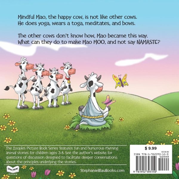 Mindful Mao, the happy cow, is not like other cows. He does yoga, wears a toga, meditates, and bows. The other cows don't know how, Mao became this way. What can they do to make Mao MOO, and not say NAMASTE?