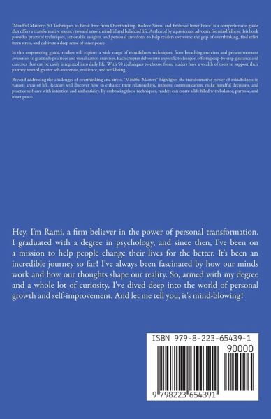 "Mindful Mastery: 50 Techniques to Break Free from Overthinking, Reduce Stress, and Embrace Inner Peace" is a comprehensive guide that offers a transformative journey toward a more mindful and balanced life. Authored by a passionate advocate for mindfulness, this book provides practical techniques, actionable insights, and personal anecdotes to help readers overcome the grip of overthinking, find relief from stress, and cultivate a deep sense of inner peace. In this empowering guide, readers will explore a wide range of mindfulness techniques, from breathing exercises and present-moment awareness to gratitude practices and visualization exercises. Each chapter delves into a specific technique, offering step-by-step guidance and exercises that can be easily integrated into daily life. With 50 techniques to choose from, readers have a wealth of tools to support their journey toward greater self-awareness, resilience, and well-being. Beyond addressing the challenges of overthinking and stress, "Mindful Mastery" highlights the transformative power of mindfulness in various areas of life. Readers will discover how to enhance their relationships, improve communication, make mindful decisions, and practice self-care with intention and authenticity. By embracing these techniques, readers can create a life filled with balance, purpose, and inner peace.