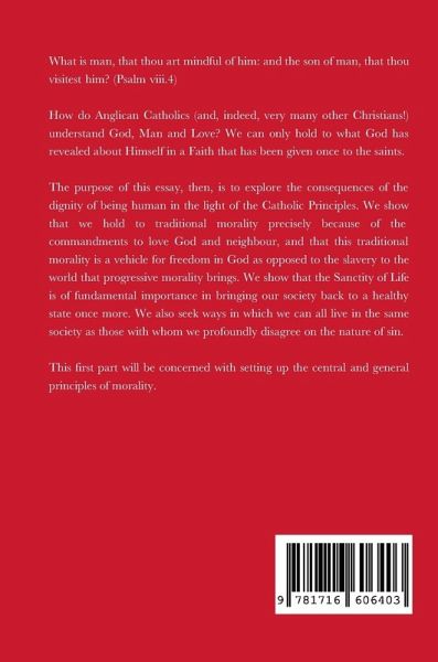 What is man, that thou art mindful of him: and the son of man, that thou visitest him? (Psalm viii4) How do Anglican Catholics (and, indeed, very many other Christians!) understand God, Man and Love? We can only hold to what God has revealed about Himself in a Faith that has been given once to the saints. The purpose of this essay, then, is to explore the consequences of the dignity of being human in the light of the Catholic Principles. We show that we hold to traditional morality precisely because of the commandments to love God and neighbour, and that this traditional morality is a vehicle for freedom in God as opposed to the slavery to the world that progressive morality brings. We show that the Sanctity of Life is of fundamental importance in bringing our society back to a healthy state once more. We also seek ways in which we can all live in the same society as those with whom we profoundly disagree on the nature of sin. This first part will be concerned with setting up the central and general principles of morality.