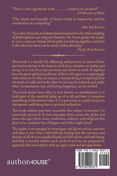 This book is a wholly life affirming and positive account of how spiritual evolution is the domain of all of us, whether we realize and accept it or not. It is very practical and down to earth. It explains how the great spiritual traditions of the world agree to a surprisingly wide extent as to what, in essence, a human being is comprised, how the truth of really and truly what we are may be realized, and under what circumstances true and lasting happiness can be availed. The book shows how what is now known as mindfulness is in truth part of the essential make up of us all and how it comprises something of the utmost value if it is perceived as a path not just to therapeutic well-being but to spiritual realization. The book outlines just how accessible this subject is because it is essentially practical. It uses examples from across the globe and down the ages from many traditions, cultures, and religions but does so in a manner free of dogma and with a light touch. The reader is encouraged to investigate and given various exercises and ideas to use. One is left with the feeling that the outcome and destiny of all of us is actually blissful and full of love and well-being, and that is entirely within reach of all of us if we are prepared to approach this vast subject with an open mind and an open heart.