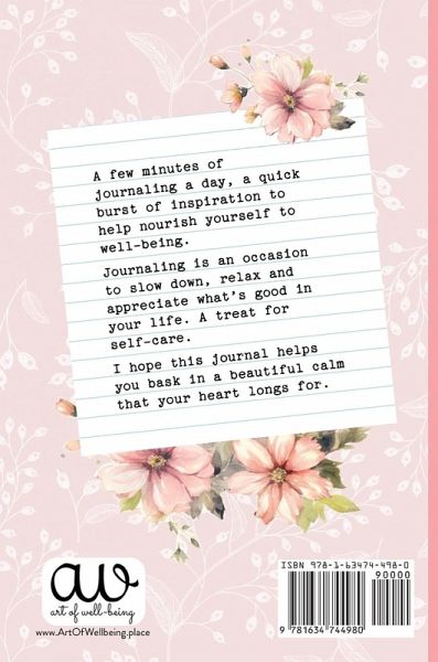 A few minutes of journaling a day, a quick burst of inspiration to help nourish yourself to well-being. Journaling is an occasion to slow down, relax and appreciate what's good in your life. A treat for self-care. I hope this guided journal with 87 prompts alongside an illustrated quote page, helps you bask in a beautiful calm that your heart longs for. Visit my website at www.ArtOfWellbeing.place to see more of my products and free downloads.