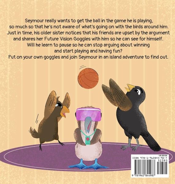 Seymour really wants to get the ball in the game he is playing, so much so that he's not aware of what's going on with the birds around him. Just in time, his older sister notices that his friends are upset by the argument and shares her Future Vision Goggles with him so he can see for himself. Will he learn to pause so he can stop arguing about winning and start playing and having fun? Put on your own goggles and join Seymour in an island adventure to find out.