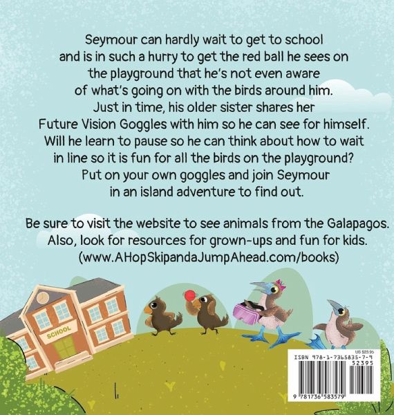 Seymour can hardly wait to get to school and is in such a hurry to get the red ball he sees on the playground that he's not even aware of what's going on with the birds around him. Justs in time, his older sister shares her Future Vision Goggles with him so he can see for himself. Will he learn to pause so he can think about how to wait in line so it is fun for all the birds on the playground? Put on your own goggles and join Seymour in an island adventure to find out.