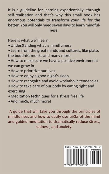 It is a guideline for learning experientially, through self-realisation and that's why this small book has enormous potentials to transform your life for the better. You will only need seven days to learn mindfulness. Here is what we'll learn: ¿ Understanding what is mindfulness ¿ Learn from the great minds and cultures, like plato, the buddhist monks and many more ¿ How to make sure we have a positive environment we can grow in ¿ How to prioritize our lives ¿ How to enjoy a good night's sleep ¿ How to recognize and avoid workaholic tendencies ¿ How to take care of our body by eating right and exercising ¿ Meditation techniques for a stress free life ¿ And much, much more! A guide that will take you through the principles of mindfulness and how to easily use tricks of the mind and guided meditation to dramatically reduce stress, sadness, and anxiety.