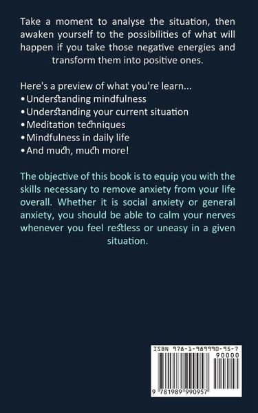 Take a moment to analyse the situation, then awaken yourself to the possibilities of what will happen if you take those negative energies and transform them into positive ones. Here's a preview of what you're learn... ¿ Understanding mindfulness ¿ Understanding your current situation ¿ Meditation techniques ¿ Mindfulness in daily life ¿ And much, much more! The objective of this book is to equip you with the skills necessary to remove anxiety from your life overall. Whether it is social anxiety or general anxiety, you should be able to calm your nerves whenever you feel restless or uneasy in a given situation.