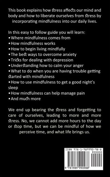 This book explains how stress affects our mind and body and how to liberate ourselves from stress by incorporating mindfulness into our daily lives. In this easy to follow guide you will learn: ¿ Where mindfulness comes from ¿ How mindfulness works ¿ How to begin living mindfully ¿ The best ways to overcome anxiety ¿ Tricks for dealing with depression ¿ Understanding how to calm your anger ¿ What to do when you are having trouble getting started with mindfulness ¿ How to use mindfulness to get a good night's sleep ¿ How mindfulness can help manage pain ¿ And much more We end up bearing the stress and forgetting to care of ourselves, leading to more and more stress. No, we cannot add more hours to the day or stop time, but we can be mindful of how we perceive time, and what life brings us.