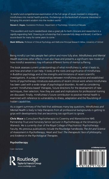 Being mindful can help people feel calmer and more fully alive. Mindfulness and Mental Health examines other effects it can also have and presents a significant new model of how mindful awareness may influence different forms of mental suffering. The book assesses current understandings of what mindfulness is, what it leads to, and how and when it can help. It looks at the roots and significance of mindfulness in Buddhist psychology and at the strengths and limitations of recent scientific investigations. A survey of relationships between mindfulness practice and established forms of psychotherapy introduces evaluations of recent clinical work where mindfulness has been used with a wide range of psychological disorders. As well as considering current 'mindfulness-based' therapies, future directions for the development of new techniques, their selection, how they are used and implications for professional training are discussed. Finally, mindfulness' future contribution to positive mental health is examined with reference to vulnerability to illness, adaptation and the flourishing of hidden capabilities. As a cogent summary of the field that addresses many key questions, Mindfulness and Mental Health is likely to help therapists from all professional backgrounds in getting to grips with developments that are becoming too significant to ignore.