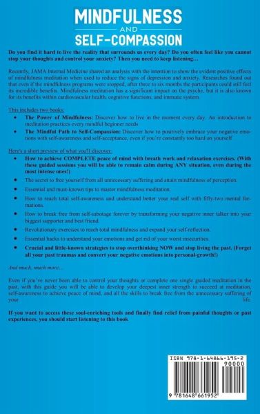 Do you find it hard to live the reality that surrounds us every day? Do you often feel like you cannot stop your thoughts and control your anxiety? Then you need to keep listening... Recently, JAMA Internal Medicine shared an analysis with the intention to show the evident positive effects of mindfulness meditation when used to reduce the signs of depression and anxiety. Researches found out that even if the mindfulness programs were stopped, after three to six months the participants could still feel its incredible benefits. This includes two books:The Power of Mindfulness: Discover how to live in the moment every day. An introduction to meditation practices every mindful beginner needs The Mindful Path to Self-Compassion: Discover how to positively embrace your negative emotions with self-awareness and self-acceptance, even if you're constantly too hard on yourself Here's a short preview of what you'll discover:How to achieve COMPLETE peace of mind with breath work and relaxation exercises. (With these guided sessions you will be able to remain calm during ANY situation, even during the most intense ones!) The secret to free yourself from all unnecessary suffering and attain mindfulness of perception. Essential and must-known tips to master mindfulness meditation. How to reach total self-awareness and understand better your real self with fifty-two mental formations. How to break free from self-sabotage forever by transforming your negative inner talker into your biggest supporter and best friend. Revolutionary exercises to reach total mindfulness and expand your self-reflection. Essential hacks to understand your emotions and get rid of your worst insecurities. Crucial and little-known strategies to stop overthinking NOW and stop living the past. (Forget all your past traumas and convert your negative emotions into personal-growth!) And much, much more... Even if you've never been able to control your thoughts or complete one single guided meditation in the past, with this guide you will be able to develop your deepest inner strength to succeed at meditation, and all the skills to break free from the unnecessary suffering of your life. If you want to access these soul-enriching tools and finally find relief from painful thoughts or past experiences, you should start reading this book
