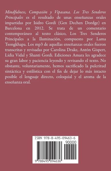 Mindfulness, Compasión y Vipasana. Los Tres Senderos Principales es el resultado de unas enseñanzas orales impartidas por Isidro Gordi (Gen Dechen Dordge) en Barcelona en el 2012. Se trata de un comentario contemporáneo al texto clásico, Los Tres Senderos Principales a la Iluminación, compuesto por Lama Tsongkhapa. Los mp3 de aquellas enseñanzas orales fueron transcritas y revisadas por Carolina Drake, Antón Gispert, Lídia Vidal y Shanti Gordi. Ediciones Amara les agradece su gran labor y paciencia leyendo y revisando el texto. No obstante, voluntariamente, hemos sacrificado la pulcritud sintáctica y estilística con el fin de dejar lo más intacto posible el lenguaje directo, coloquial y el aroma de la enseñanza oral.