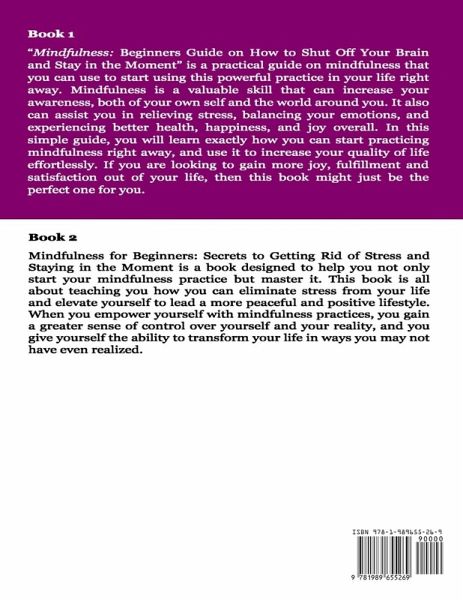 This two-book bundle includes Mindfulness: Beginners Guide on How to Shut Off Your Brain and Stay in the Moment and Mindfulness for Beginners: Secrets to Getting Rid of Stress and Staying in the Moment. Mindfulness: Beginners Guide on How to Shut Off Your Brain and Stay in the Moment is a practical guide on mindfulness that you can use to start using this powerful practice in your life right away. Mindfulness is a valuable skill that can increase your awareness, both of your own self and the world around you. It also can assist you in relieving stress, balancing your emotions, and experiencing better health, happiness, and joy overall. In this simple guide, you will learn exactly how you can start practicing mindfulness right away, and use it to increase your quality of life effortlessly. If you are looking to gain more joy, fulfillment and satisfaction out of your life, then this book might just be the perfect one for you. Mindfulness for Beginners: Secrets to Getting Rid of Stress and Staying in the Moment is a book designed to help you not only start your mindfulness practice but master it. This book is all about teaching you how you can eliminate stress from your life and elevate yourself to lead a more peaceful and positive lifestyle. When you empower yourself with mindfulness practices, you gain a greater sense of control over yourself and your reality, and you give yourself the ability to transform your life in ways you may not have even realized.
