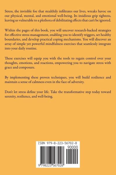 Are you tired of being overwhelmed by the demands of everyday life? Do you long for a sanctuary of tranquility in the midst of a hectic world? Look no further. Stress, the invisible foe that stealthily infiltrates our lives, wreaks havoc on our physical, mental, and emotional well-being. Its insidious grip tightens, leaving us vulnerable to a plethora of debilitating effects that can't be ignored. Immerse yourself in the timeless wisdom shared by the author of this book, seamlessly merging ancient mindfulness practices with the cutting-edge marvels of neuroscience. Brace yourself for a mind-altering experience as you awaken to the limitless possibilities that await you. This book offers a practical and accessible guide to incorporating mindfulness into your daily routine, empowering you to navigate stress with grace and rediscover inner peace. Through their guidance, you'll develop a heightened awareness of the present moment, fostering a deep connection with yourself and others. As you embrace mindfulness, you'll witness stress melting away, replaced by a newfound tranquility and an unwavering sense of inner harmony. Practical mindfulness exercises: Discover simple yet powerful exercises to integrate into your routine, regaining control over thoughts, emotions, and reactions. Effective stress management: Learn research-backed strategies to identify triggers, set boundaries, and develop coping mechanisms for resilience. Cultivating self-awareness: Observe thoughts and emotions without judgment, fostering deep understanding of oneself. Finding inner peace amidst challenges: Create moments of stillness and tranquility, even in a busy schedule, for serenity and balance. Long-term mindfulness integration: Sustain mindfulness in work, relationships, self-care, and personal growth for lasting stress relief and inner peace and much more Whether you're a busy professional, a student facing exam pressures, or simply someone seeking solace from the demands of modern life, this book is your gateway to a life of greater balance, clarity, and fulfillment. Step into a world where stress holds no power, and where inner peace and calmness become your natural state. Don't let stress define your life. Embark on this transformative journey today and embrace a life filled with lasting peace!