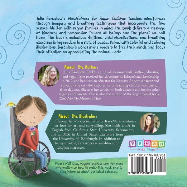 Julia Barcalow's Mindfulness for Vegan Children teaches mindfulness through imagery and breathing techniques that incorporate the five senses. Written with vegan families in mind, the book delivers a message of kindness and compassion toward all beings and the planet we call home. The book's melodious rhythms, vivid visualizations, and breathing exercises bring readers to a state of peace. Paired with colorful and calming illustrations, Barcalow's calming words invite readers to free their minds and focus their attention on appreciating the natural world.