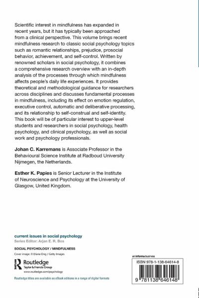 Scientific interest in mindfulness has expanded in recent years, but it has typically been approached from a clinical perspective. This volume brings recent mindfulness research to classic social psychology topics such as romantic relationships, prejudice, prosocial behavior, achievement, and self-control. Written by renowned scholars in social psychology, it combines a comprehensive research overview with an in-depth analysis of the processes through which mindfulness affects people's daily life experiences. It provides theoretical and methodological guidance for researchers across disciplines and discusses fundamental processes in mindfulness, including its effect on emotion regulation, executive control, automatic and deliberative processing, and its relationship to self-construal and self-identity. This book will be of particular interest to upper-level students and researchers in social psychology, health psychology, and clinical psychology, as well as social work and psychology professionals.