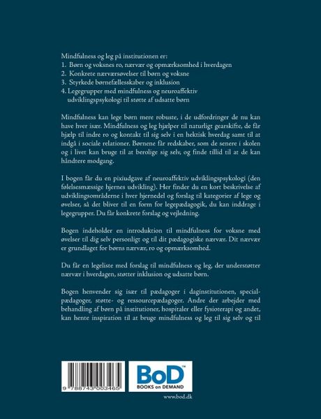 Bogen indeholder en introduktion til mindfulness for voksne med øvelser til dig selv personligt og til dit pædagogiske nærvær. Dit nærvær er grundlaget for børns nærvær, ro og opmærksomhed. Du får en legeliste med forslag til mindfulness og leg, der understøtter nærvær i hverdagen, støtter inklusion og udsatte børn.