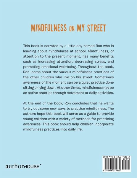 This book is narrated by a little boy named Ron who is learning about mindfulness at school. Mindfulness, or attention to the present moment, has many benefits such as increasing attention, decreasing stress, and promoting emotional well-being. Throughout the book, Ron learns about the various mindfulness practices of the other children who live on his street. Sometimes awareness of the moment can be a quiet practice done sitting or lying down. At other times, mindfulness may be an active practice through movement or daily activities. At the end of the book, Ron concludes that he wants to try…mehr