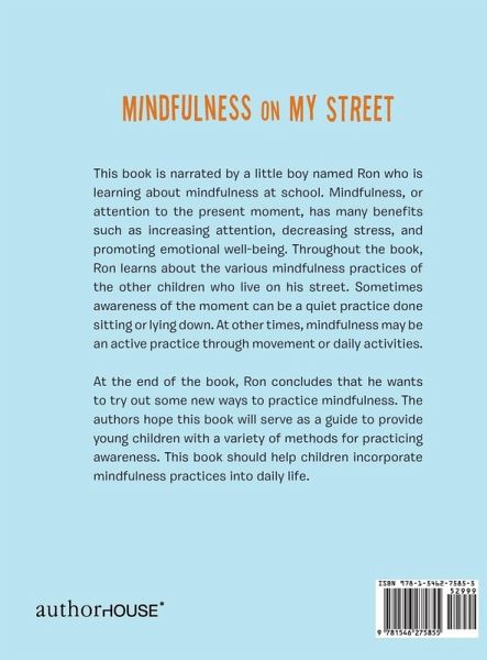 This book is narrated by a little boy named Ron who is learning about mindfulness at school. Mindfulness, or attention to the present moment, has many benefits such as increasing attention, decreasing stress, and promoting emotional well-being. Throughout the book, Ron learns about the various mindfulness practices of the other children who live on his street. Sometimes awareness of the moment can be a quiet practice done sitting or lying down. At other times, mindfulness may be an active practice through movement or daily activities. At the end of the book, Ron concludes that he wants to try…mehr