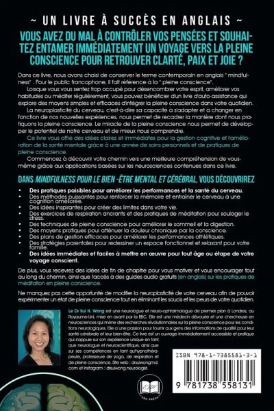 ~ Un livre à succès en anglais ~ Vous avez du mal à contrôler vos pensées et souhaitez entamer immédiatement un voyage vers la pleine conscience pour retrouver clarté, paix et joie ? Dans ce livre, nous avons choisi de conserver le terme contemporain en anglais '' mindfulness'' . Pour le public francophone, il fait référence à la '' pleine conscience''. Lorsque vous vous sentez trop occupé pour désencombrer votre esprit, améliorer vos habitudes ou méditer régulièrement, vous pouvez bénéficier d'un livre d'auto-assistance qui explore des moyens simples et efficaces d'intégrer la pleine conscience dans votre quotidien. Ce livre vous offre des idées claires et immédiates pour la gestion cognitive et l'amélioration de la santé mentale grâce à une année de soins personnels et de pratiques de pleine conscience. Dans Mindfulness pour le bien-être mental et cérébral, vous découvrirez :Des pratiques paisibles pour améliorer les performances et la santé du cerveau. Des méthodes puissantes pour renforcer la mémoire et entraîner le cerveau à une cognition améliorée. Des idées inspirantes pour créer des limites dans votre vie. Des exercices de respiration ancrants et des pratiques de méditation pour soulager le stress. Des techniques de pleine conscience pour améliorer le sommeil et la digestion. Des moyens pratiques pour atténuer la douleur chronique par la conscience. Des plans de gestion efficaces pour améliorer les performances athlétiques. Des stratégies parentales pour redessiner un espace fonctionnel et relaxant pour votre famille. Des idées immédiates et faciles à mettre en uvre pour tout âge ou étape de votre voyage conscient. De plus, vous recevrez des idées de fin de chapitre pour vous motiver et vous encourager tout au long du chemin, ainsi que l'accès à des guides audio gratuits (en anglais) sur les pratiques de méditation en pleine conscience.