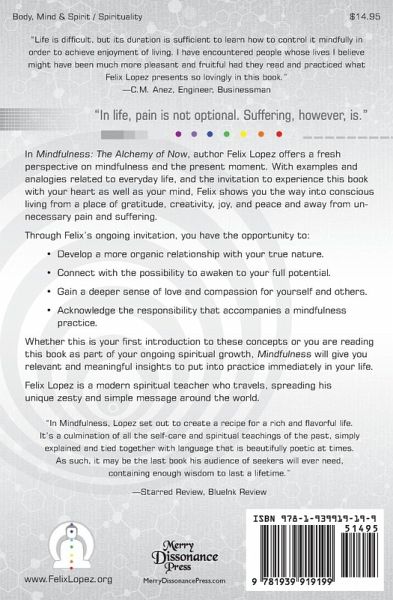 In Mindfulness: The Alchemy of Now, author Felix Lopez offers a fresh perspective on mindfulness and the present moment. With examples and analogies related to everyday life, and the invitation to experience this book with your heart as well as your mind, Felix shows you the way into conscious living from a place of gratitude, creativity, joy, and peace and away from unnecessary pain and suffering. Through Felix's ongoing invitation, you have the opportunity to: ¿ Develop a more organic relationship with your true nature. ¿ Connect with the possibility to awaken to your full potential. ¿ Gain a deeper sense of love and compassion for yourself and others. ¿ Acknowledge the responsibility that accompanies a mindfulness practice. Whether this is your first introduction to these concepts or you are reading this book as part of your ongoing spiritual growth, Mindfulness will give you relevant and meaningful insights to put into practice immediately in your life. Felix Lopez is a modern spiritual teacher who travels, spreading his unique zesty and simple message around the world.