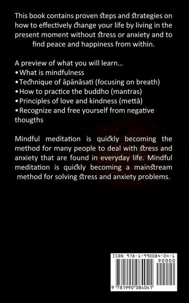 This book contains proven steps and strategies on how to effectively change your life by living in the present moment without stress or anxiety and to find peace and happiness from within. A preview of what you will learn... ¿ What is mindfulness ¿ Technique of ¿p¿n¿sati (focusing on breath) ¿ How to practice the buddho (mantras) ¿ Principles of love and kindness (mett¿) ¿ Recognize and free yourself from negative thougths Mindful meditation is quickly becoming the method for many people to deal with stress and anxiety that are found in everyday life. Mindful meditation is quickly becoming a mainstream method for solving stress and anxiety problems.