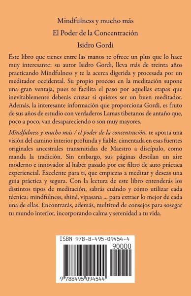 Mindfulness y mucho más El Poder de la Concentración Isidro Gordi Este libro que tienes entre las manos te ofrece un plus que lo hace muy interesante: su autor Isidro Gordi, lleva más de treinta años practicando Mindfulness y te la acerca digerida y procesada por un meditador occidental. Su propio proceso en la meditación supone una gran ventaja, pues te facilita el paso por aquellas etapas que inevitablemente deberás cruzar si quieres ser un buen meditador. Además, la interesante información que proporciona Gordi, es fruto de sus años de estudio con verdaderos Lamas tibetanos de antaño que, poco a poco, van desapareciendo o son muy mayores. Mindfulness y mucho más / el poder de la concentración, te aporta una visión del camino interior profunda y fiable, cimentada en esas fuentes originales ancestrales transmitidas de Maestro a discípulo, como manda la tradición. Sin embargo, sus páginas destilan un aire moderno e innovador al haber pasado por ese filtro de auto práctica experiencial. Excelente para ti, que empiezas a meditar y deseas una guía práctica y segura. Con la lectura de este libro entenderás los distintos tipos de meditación, sabrás cuándo y cómo utilizar cada técnica: mindfulness, shiné, vipasana ... para extraer lo mejor de cada una de ellas. Encontrarás, además, multitud de consejos para sosegar tu mundo interior, incorporando calma y serenidad a tu vida.