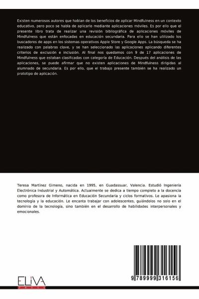 Existen numerosos autores que hablan de los beneficios de aplicar Mindfulness en un contexto educativo, pero poco se habla de aplicarlo mediante aplicaciones móviles. Es por ello que el presente libro trata de realizar una revisión bibliográfica de aplicaciones móviles de Mindfulness que están enfocadas en educación secundaria. Para ello se han utilizado los buscadores de apps en los sistemas operativos Apple Store y Google Apps. La búsqueda se ha realizado con palabras clave, y se han seleccionado las aplicaciones aplicando diferentes criterios de exclusión e inclusión. Al final nos quedamos con 9 de 17 aplicaciones de Mindfulness que estaban clasificadas con categoría de Educación. Después del análisis de las aplicaciones, se puede afirmar que no existen aplicaciones de Mindfulness dirigidas al alumnado de secundaria. Es por ello, que el trabajo presente también se ha realizado un prototipo de aplicación.