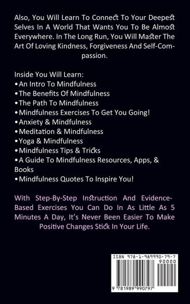 Also, You Will Learn To Connect To Your Deepest Selves In A World That Wants You To Be Almost Everywhere. In The Long Run, You Will Master The Art Of Loving Kindness, Forgiveness And Self-Compassion. Inside You Will Learn: ¿ An Intro To Mindfulness ¿ The Benefits Of Mindfulness ¿ The Path To Mindfulness ¿ Mindfulness Exercises To Get You Going! ¿ Anxiety & Mindfulness ¿ Meditation & Mindfulness ¿ Yoga & Mindfulness ¿ Mindfulness Tips & Tricks ¿ A Guide To Mindfulness Resources, Apps, & Books ¿ Mindfulness Quotes To Inspire You! With Step-By-Step Instruction And Evidence-Based Exercises You Can Do In As Little As 5 Minutes A Day, It's Never Been Easier To Make Positive Changes Stick In Your Life.