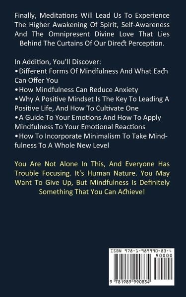 Finally, Meditations Will Lead Us To Experience The Higher Awakening Of Spirit, Self-Awareness And The Omnipresent Divine Love That Lies Behind The Curtains Of Our Direct Perception. In Addition, You'll Discover: ¿ Different Forms Of Mindfulness And What Each Can Offer You ¿ How Mindfulness Can Reduce Anxiety ¿ Why A Positive Mindset Is The Key To Leading A Positive Life, And How To Cultivate One ¿ A Guide To Your Emotions And How To Apply Mindfulness To Your Emotional Reactions ¿ How To Incorporate Minimalism To Take Mindfulness To A Whole New Level You Are Not Alone In This, And Everyone Has Trouble Focusing. It's Human Nature. You May Want To Give Up, But Mindfulness Is Definitely Something That You Can Achieve!