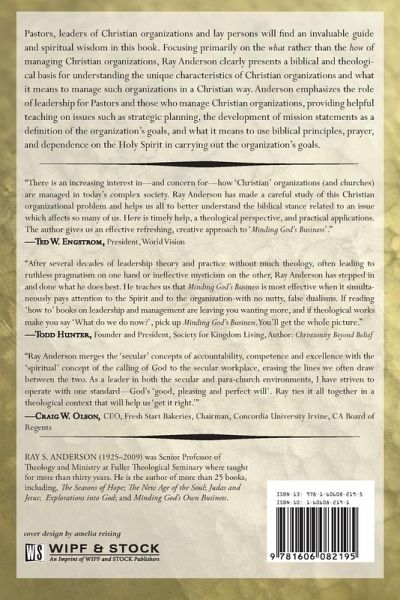 Pastors, leaders of Christian organizations, and lay persons will find an invaluable guide and spiritual wisdom in this book. Focusing primarily on the what rather than the how of managing Christian organizations, Ray Anderson clearly presents a biblical and theological basis for understanding the unique characteristics of Christian organizations and what it means to manage such organizations in a Christian way. Anderson emphasizes the role of leadership for pastors and those who manage Christian organizations, providing helpful teaching on issues such as strategic planning, the development of mission statements as a definition of the organization's goals, and what it means to use biblical principles, prayer, and dependence on the Holy Spirit in carrying out the organization's goals.