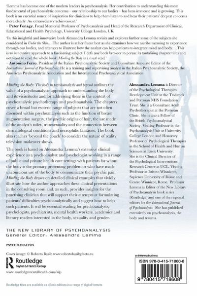 'In this insightful and innovative book Alessandra Lemma revisits and explores further some of the subjects she considered in Under the Skin.... The author is at her fluent best as she examines how we ascribe meaning to experience through our bodies, and attempts to illustrate how the analyst can help patients re-integrate mind and body... This is an innovative approach to a fascinating subject. I defy any book browser to peruse its tantalising chapter titles and not want to read the whole book. Minding the Body is a must read.' - Antonino Ferro, President of the Italian Psychoanalytic Society and Consultant Associate Editor of the International Journal of Psychoanalysis. He is a training and supervising analyst in the Italian Psychoanalytic Society, the American Psychoanalytic Association and the International Psychoanalytical Association.