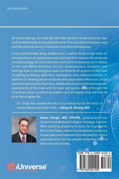 As human beings, we have the ultimate desire to understand the soul and its relationship to the physical world. The connection between soul and the physical world is important and all encompassing. In his book Mindless Body, Endless Soul 2, author Amar Singh relies on his experience as a physician and psychiatrist to explain the anatomy and physiology of consciousness and unconsciousness as it relates to the soul. While detailing why our consciousness, thoughts, and feelings have a neurological basis, he dissects all aspects of the soul, including its history, definition, motivation, and related emotions. In addition to sharing personal stories and applicable references, Singh examines personality disorders, details electrical and electromagnetic assessments of the brain and the soul, and guides others through the six primary steps to attaining wisdom and spirituality that will help all of us live a happy life. Dr. Singh has opened the door to understand on the basis of neuroscience and reality of life.Udaya K. Shetty, MD
