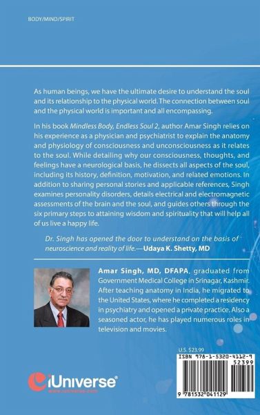 As human beings, we have the ultimate desire to understand the soul and its relationship to the physical world. The connection between soul and the physical world is important and all encompassing. In his book Mindless Body, Endless Soul 2, author Amar Singh relies on his experience as a physician and psychiatrist to explain the anatomy and physiology of consciousness and unconsciousness as it relates to the soul. While detailing why our consciousness, thoughts, and feelings have a neurological basis, he dissects all aspects of the soul, including its history, definition, motivation, and related emotions. In addition to sharing personal stories and applicable references, Singh examines personality disorders, details electrical and electromagnetic assessments of the brain and the soul, and guides others through the six primary steps to attaining wisdom and spirituality that will help all of us live a happy life. Dr. Singh has opened the door to understand on the basis of neuroscience and reality of life.Udaya K. Shetty, MD
