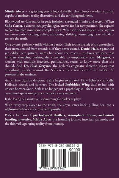 Mind's Abyss - a gripping psychological thriller that plunges readers into the depths of madness, reality distortion, and the terrifying unknown. Blackwood Asylum stands in eerie isolation, shrouded in mist and secrets. When Sofia Carter, a determined psychologist, arrives for her new position, she expects to face troubled minds and complex cases. What she doesn't expect is the asylum itself-an entity seemingly alive, whispering, shifting, consuming those who dare to seek the truth. One by one, patients vanish without a trace. Their rooms are left eerily untouched, their names erased from records as if they never existed. Daniel Hale, a paranoid yet oddly lucid patient, warns her about the voices-insidious whispers that infiltrate thoughts, pushing the vulnerable to unspeakable acts. Margaret, a woman with multiple fractured personalities, seems to know more than she should. And Dr. Elias Grayson, the asylum's enigmatic director, insists that everything is under control. But Sofia sees the cracks beneath the surface, the patterns in the madness. As her investigation deepens, reality begins to unravel. Time behaves erratically. Hallways stretch and contract. The locked Forbidden Wing calls to her with unseen horrors. Soon, Sofia is no longer just a psychologist-she is a patient in her own mind, questioning every memory, every moment. Is she losing her sanity, or is something far darker at play? With every step closer to the truth, the abyss stares back, pulling her into a nightmare where escape may be impossible. Perfect for fans of psychological thrillers, atmospheric horror, and mind-bending mysteries, Mind's Abyss is a haunting journey into fear, paranoia, and the thin veil separating reality from insanity.