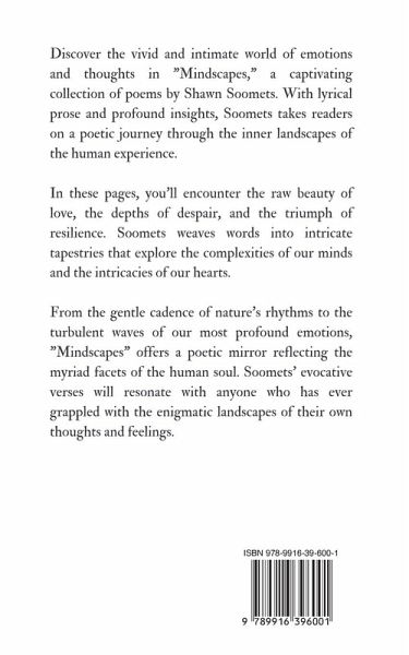 Discover the vivid and intimate world of emotions and thoughts in "Mindscapes," a captivating collection of poems by Shawn Soomets. With lyrical prose and profound insights, Soomets takes readers on a poetic journey through the inner landscapes of the human experience.In these pages, you'll encounter the raw beauty of love, the depths of despair, and the triumph of resilience. Soomets weaves words into intricate tapestries that explore the complexities of our minds and the intricacies of our hearts.From the gentle cadence of nature's rhythms to the turbulent waves of our most profound emotions, "Mindscapes" offers a poetic mirror reflecting the myriad facets of the human soul. Soomets' evocative verses will resonate with anyone who has ever grappled with the enigmatic landscapes of their own thoughts and feelings.Copyright (c) 2024 Magical Fairy Tales Publishing