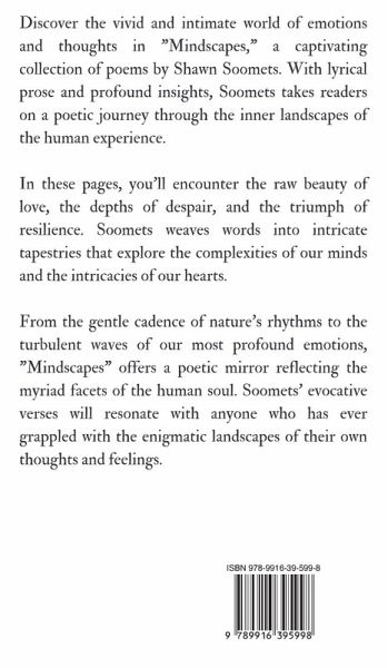 Discover the vivid and intimate world of emotions and thoughts in "Mindscapes," a captivating collection of poems by Shawn Soomets. With lyrical prose and profound insights, Soomets takes readers on a poetic journey through the inner landscapes of the human experience.In these pages, you'll encounter the raw beauty of love, the depths of despair, and the triumph of resilience. Soomets weaves words into intricate tapestries that explore the complexities of our minds and the intricacies of our hearts.From the gentle cadence of nature's rhythms to the turbulent waves of our most profound emotions, "Mindscapes" offers a poetic mirror reflecting the myriad facets of the human soul. Soomets' evocative verses will resonate with anyone who has ever grappled with the enigmatic landscapes of their own thoughts and feelings.Copyright (c) 2024 Magical Fairy Tales Publishing