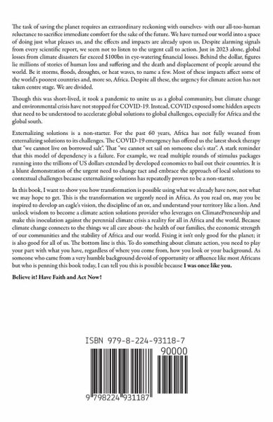 The task of saving the planet requires an extraordinary reckoning with ourselves- with our all-too-human reluctance to sacrifice immediate comfort for the sake of the future. We have turned our world into a space of doing just what pleases us, and the effects and impacts are already upon us. Despite alarming signals from every scientific report, we seem not to listen to the urgent call to action. Just in 2023 alone, global losses from climate disasters far exceed $100bn in eye-watering financial losses. Behind the dollar, figures lie millions of stories of human loss and suffering and the death and displacement of people around the world. Be it storms, floods, droughts, or heat waves, to name a few. Most of these impacts affect some of the world's poorest countries and, more so, Africa. Despite all these, the urgency for climate action has not taken centre stage. We are divided. Though this was short-lived, it took a pandemic to unite us as a global community, but climate change and environmental crisis have not stopped for COVID-19. Instead, COVID exposed some hidden aspects that need to be understood to accelerate global solutions to global challenges, especially for Africa and the global south. Externalizing solutions is a non-starter. For the past 60 years, Africa has not fully weaned from externalizing solutions to its challenges. The COVID-19 emergency has offered us the latest shock therapy that "we cannot live on borrowed salt". That "we cannot set sail on someone else's star". A stark reminder that this model of dependency is a failure. For example, we read multiple rounds of stimulus packages running into the trillions of US dollars extended by developed economies to bail out their countries. It is a blunt demonstration of the urgent need to change tact and embrace the approach of local solutions to contextual challenges because externalizing solutions has repeatedly proven to be a non-starter. In this book, I want to show you how transformation is possible using what we already have now, not what we may hope to get. This is the transformation we urgently need in Africa. As you read on, may you be inspired to develop an eagle's vision, the discipline of an ox, and understand your territory like a lion. And unlock wisdom to become a climate action solutions provider who leverages on ClimatePreneurship and make this inoculation against the perennial climate crisis a reality for all in Africa and the world. Because climate change connects to the things we all care about- the health of our families, the economic strength of our communities and the stability of Africa and our world. Fixing it isn't only good for the planet; it is also good for all of us. The bottom line is this. To do something about climate action, you need to play your part with what you have, regardless of where you come from, how you look or your background. As someone who came from a very humble background devoid of opportunity or affluence like most Africans but who is penning this book today, I can tell you this is possible because I was once like you. Believe it! Have Faith and Act Now!