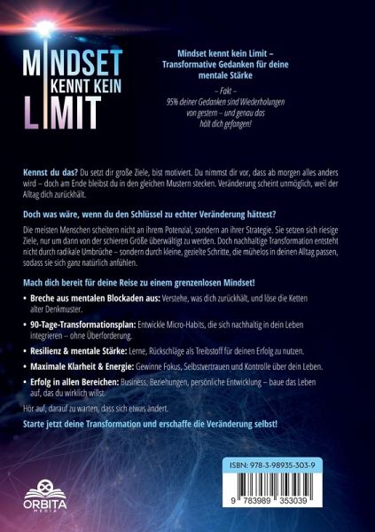 Entfessele dein volles Potenzial und gestalte dein Leben nach deinen eigenen Regeln! Fakt: 95 % deiner Gedanken sind Wiederholungen von gestern - und genau das hält dich gefangen! Kennst du das? "Ab morgen wird alles anders!" - aber wird es das wirklich? Jeden Tag drehst du dich im Kreis - gefangen in alten Gewohnheiten, die dich zurückhalten, und Vorsätzen, die immer wieder scheitern. Vielleicht hast du dir diesen Satz schon oft gesagt, nur um dann doch wieder an den gleichen Mustern zu scheitern. Es ist ein ständiger Kampf: zwischen deinem Wunsch nach Veränderung und der Bequemlichkeit, die dich festhält. In einer Welt voller Ablenkungen bleibt kaum Zeit für echte Selbstreflexion - und genau hier liegt der Schlüssel. Wer versteht, was ihn zurückhält, kann gezielt die richtigen Schritte setzen. Doch die meisten machen einen entscheidenden Fehler: Sie nehmen sich zu viel auf einmal vor. Große Ziele wirken motivierend, werden aber schnell überwältigend - und dann geben wir auf. Vielleicht hast du auch gehört: "Nach 21 Tagen wird eine Gewohnheit zur Routine." Klingt gut, oder? Doch die Wahrheit ist: Nachhaltige Veränderung braucht mehr. Nicht radikale Umbrüche, sondern kleine, gezielte Anpassungen, die sich mühelos in deinen Alltag integrieren lassen, bis sie ganz natürlich werden. Mach dich bereit für deine Reise zu einem grenzenlosen Mindset! ¿ Vom Gefangenen zum Gestalter: Befreie dich aus den Ketten deiner alten Denkmuster und erschaffe dein eigenes Schicksal. ¿ Der 90-Tage-Transformationsplan: Entwickle Micro-Habits, die dich Tag für Tag näher an dein ultimatives Ziel bringen - ohne Überforderung, ohne Ausreden. ¿ Resilienz & mentale Kraft: Lerne, Rückschläge nicht nur zu überstehen, sondern sie als Treibstoff für dein Wachstum zu nutzen. ¿ Maximale Klarheit & Energie: Löse mentale Blockaden auf, werde fokussierter als je zuvor und nutze dein volles Potenzial. ¿ Freiheit & Balance: Lerne, wie du Zeit und Energie für das findest, was wirklich zählt - für dich, deine Familie und deine Vision. Ganzheitliche Transformation: Dieses Buch ist kein gewöhnliches Motivationsbuch - es ist dein Schlüssel zu einem erfüllten Leben auf allen Ebenen. Körper, Geist und Emotionen sind untrennbar miteinander verbunden. Deshalb bekommst du hier nicht nur mentale Strategien, sondern auch konkrete Ansätze für mehr Glück, Erfüllung und Erfolg in jedem Bereich deines Lebens. Mit glasklaren Strategien, bewährten Methoden und einem strukturierten Schritt-für-Schritt-Plan zeigt dir "Mindset kennt kein Limit", wie du deine Ziele endlich erreichst und ein Leben voller Freiheit, Selbstbestimmung und Erfolg führst. Bestelle jetzt dein Exemplar und starte deine Transformation! Hör auf zu warten - erschaffe die Veränderung selbst.