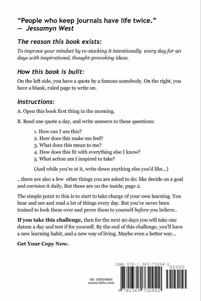 Take this 90 Day Challenge and re-stack your mindset. Because: Men can only be happy when they do not assume that the object of life is happiness. -- George Orwell Men are born to succeed, not to fail. -- Henry David Thoreau Men always want to be a woman's first love, women like to be a man's last romance. -- Oscar Wilde Many persons have a wrong idea of what constitutes true happiness. It is not attained through self-gratification but through fidelity to a worthy purpose. -- Helen Adams Keller Many people think that if they were only in some other place, or had some other job, they would be happy. Well, that is doubtful. So get as much happiness out of what you are doing as you can and don't put off being happy until some future date. -- Dale Carnegie The reason this book exists: To improve your mindset by re-stacking it intentionally every day for 90 days with inspirational, thought-provoking ideas. Get Your Copy Now.