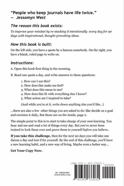 Take this 90 Day Challenge and re-stack your mindset. Because: - If you wait until all the lights are "green" before you leave home, you'll never get started on your trip to the top. -- Zig Ziglar - If you don't set goals, you can't regret not reaching them. -- Yogi Berra - A pessimist sees the difficulty in every opportunity; an optimist sees the opportunity in every difficulty. -- Winston Churchill - Ability may take you to the top, but it takes character to stay there. -- William Blake - If you can imagine it, you can create it. If you can dream it, you can become it. -- William Arthur Ward - If you want to be successful, it's just this simple: Know what you are doing, love what you are doing, and believe in what you are doing. -- Will Rogers The reason this book exists: To improve your mindset by re-stacking it intentionally every day for 90 days with inspirational, thought-provoking ideas.