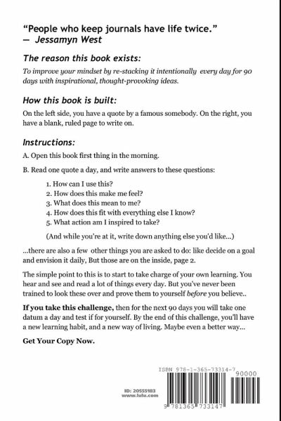 Take this 90 Day Challenge and re-stack your mindset. Because: - Vision without action is merely a dream. Action without vision just passes the time. Vision with action can change the world. -- Joel Barker - Victory is the beautiful, bright-colored flower. Transport is the stem without which it could never have blossomed. -- Winston Churchill - Victory is always possible for the person who refuses to stop fighting. -- Napoleon Hill - Very little is needed to make a happy life; it is all within yourself, in your way of thinking. -- Marcus Aurelius Antoninus - Variability is the law of life, and as no two faces are the same, so no two bodies are alike, and no two individuals react alike and behave alike under the abnormal conditions which we know as disease. -- William Osler The reason this book exists: To improve your mindset by re-stacking it intentionally every day for 90 days with inspirational, thought-provoking ideas. Get Your Copy Now.