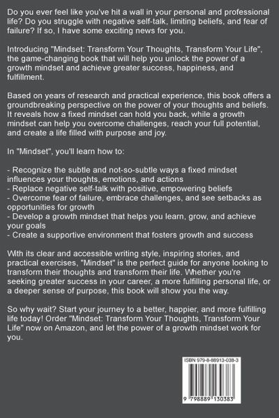 Do you ever feel like you've hit a wall in your personal and professional life? Do you struggle with negative self-talk, limiting beliefs, and fear of failure? If so, I have some exciting news for you. Introducing "Mindset: Transform Your Thoughts, Transform Your Life", the game-changing book that will help you unlock the power of a growth mindset and achieve greater success, happiness, and fulfillment. Based on years of research and practical experience, this book offers a groundbreaking perspective on the power of your thoughts and beliefs. It reveals how a fixed mindset can hold you back, while a growth mindset can help you overcome challenges, reach your full potential, and create a life filled with purpose and joy. In "Mindset", you'll learn how to: Recognize the subtle and not-so-subtle ways a fixed mindset influences your thoughts, emotions, and actions Replace negative self-talk with positive, empowering beliefs Overcome fear of failure, embrace challenges, and see setbacks as opportunities for growth Develop a growth mindset that helps you learn, grow, and achieve your goals Create a supportive environment that fosters growth and success With its clear and accessible writing style, inspiring stories, and practical exercises, "Mindset" is the perfect guide for anyone looking to transform their thoughts and transform their life. Whether you're seeking greater success in your career, a more fulfilling personal life, or a deeper sense of purpose, this book will show you the way. So why wait? Start your journey to a better, happier, and more fulfilling life today! Order "Mindset: Transform Your Thoughts, Transform Your Life" now on Amazon, and let the power of a growth mindset work for you.