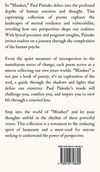 In "Mindset," Paul Pääsuke delves into the profound depths of human emotion and thought. This captivating collection of poems explores the landscapes of mental resilience and vulnerability, revealing how our perspectives shape our realities. With lyrical precision and poignant insights, Pääsuke invites readers on a journey through the complexities of the human psyche. From the quiet moments of introspection to the tumultuous waves of change, each poem serves as a mirror reflecting our own inner worlds. "Mindset" is not just a book of poetry; it's an exploration of the soul, a guide through the shadows and lights that define our existence. Paul Pääsuke's words will challenge you, comfort you, and inspire you to view life through a renewed lens. Step into the world of "Mindset" and let your thoughts unfold in the rhythm of these powerful verses. This collection is a testament to the enduring spirit of humanity and a must-read for anyone seeking to understand the power of perspective. Copyright © 2024 Book Fairy Publishing
