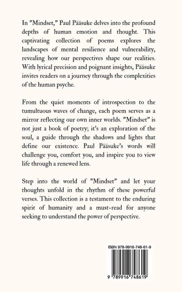 In "Mindset," Paul Pääsuke delves into the profound depths of human emotion and thought. This captivating collection of poems explores the landscapes of mental resilience and vulnerability, revealing how our perspectives shape our realities. With lyrical precision and poignant insights, Pääsuke invites readers on a journey through the complexities of the human psyche. From the quiet moments of introspection to the tumultuous waves of change, each poem serves as a mirror reflecting our own inner worlds. "Mindset" is not just a book of poetry; it's an exploration of the soul, a guide through the shadows and lights that define our existence. Paul Pääsuke's words will challenge you, comfort you, and inspire you to view life through a renewed lens. Step into the world of "Mindset" and let your thoughts unfold in the rhythm of these powerful verses. This collection is a testament to the enduring spirit of humanity and a must-read for anyone seeking to understand the power of perspective. Copyright © 2024 Book Fairy Publishing