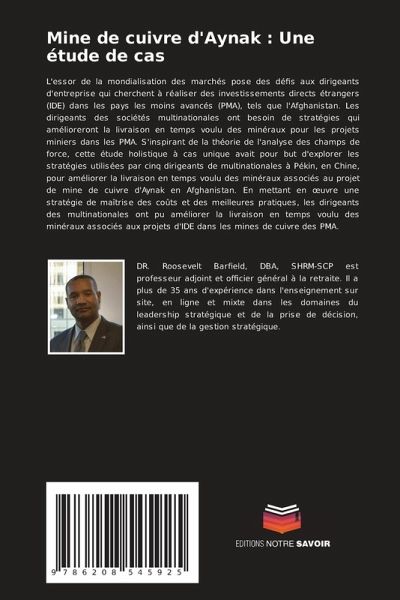 L'essor de la mondialisation des marchés pose des défis aux dirigeants d'entreprise qui cherchent à réaliser des investissements directs étrangers (IDE) dans les pays les moins avancés (PMA), tels que l'Afghanistan. Les dirigeants des sociétés multinationales ont besoin de stratégies qui amélioreront la livraison en temps voulu des minéraux pour les projets miniers dans les PMA. S'inspirant de la théorie de l'analyse des champs de force, cette étude holistique à cas unique avait pour but d'explorer les stratégies utilisées par cinq dirigeants de multinationales à Pékin, en Chine, pour améliorer la livraison en temps voulu des minéraux associés au projet de mine de cuivre d'Aynak en Afghanistan. En mettant en oeuvre une stratégie de maîtrise des coûts et des meilleures pratiques, les dirigeants des multinationales ont pu améliorer la livraison en temps voulu des minéraux associés aux projets d'IDE dans les mines de cuivre des PMA.