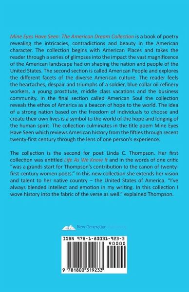 Mine Eyes Have Seen: The American Dream Collection is a book of poetry revealing the intricacies, contradictions and beauty in the American character. The collection begins with American Places and takes the reader through a series of glimpses into the impact the vast magnificence of the American landscape had on shaping the nation and people of the United States. The second section is called American People and explores the different facets of the diverse American culture. The reader feels the heartaches, despair and triumphs of a soldier, blue collar oil refinery workers, a young prostitute, middle class vacations and the business community. In the final section called American Soul the collection reveals the ethos of America as a beacon of hope to the world. The idea of a strong nation based on the freedom of individuals to choose and create their own lives is a symbol to the world of the hope and longing of the human spirit. The collection culminates in the title poem Mine Eyes Have Seen which reviews American history from the fifties through recent twenty-first century through the lens of one person's experience. The collection is the second for poet Linda C. Thompson. Her first collection was entitled Life As We Know It and in the words of one critic "was a grands start for Thompson's contribution to the canon of twenty-first-century women poets." In this new collection she extends her vision and talent to her native country - the United States of America. "I've always blended intellect and emotion in my writing. In this collection I wove history into the fabric of the verse as well." explained Thompson.