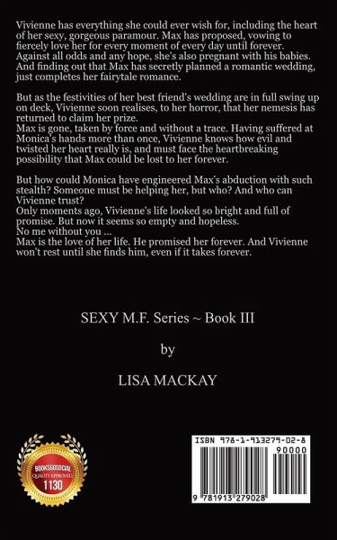 Vivienne has everything she could ever wish for, including the heart of her sexy, gorgeous paramour. Max has proposed, vowing to fiercely love her for every moment of every day until forever. Against all odds and any hope, she's also pregnant with his babies. And finding out that he's secretly planned a romantic wedding just completes her fairy-tale romance. But as the festivities of her best friend's wedding are in full swing up on deck, Vivienne soon realises, to her horror, that her nemesis has returned to claim her prize. Max is gone, taken by force and without a trace. Having suffered the wrath of Monica more than once, Vivienne knows only too well how evil and twisted her heart really is. Vivienne must face the heart-breaking possibility that Max could be lost to her forever. But how could Monica have engineered Max's abduction with such stealth? She must have help. If so, who can Vivienne trust? And what will become of Max? Only moments ago, Vivienne's future looked so bright and full of promise. But now, it seems so empty and hopeless. No me without you. Max is the love of her life. He promised her forever, and Vivienne won't rest until she finds him. Even if it takes forever.