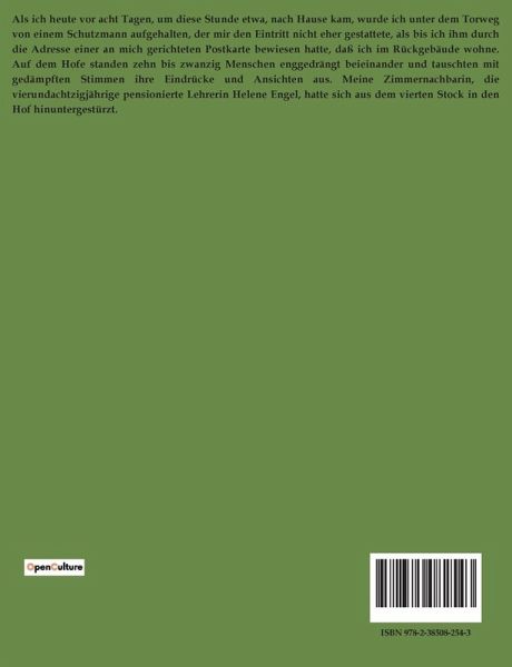 Als ich heute vor acht Tagen, um diese Stunde etwa, nach Hause kam, wurde ich unter dem Torweg von einem Schutzmann aufgehalten, der mir den Eintritt nicht eher gestattete, als bis ich ihm durch die Adresse einer an mich gerichteten Postkarte bewiesen hatte, daß ich im Rückgebäude wohne. Auf dem Hofe standen zehn bis zwanzig Menschen enggedrängt beieinander und tauschten mit gedämpften Stimmen ihre Eindrücke und Ansichten aus. Meine Zimmernachbarin, die vierundachtzigjährige pensionierte Lehrerin Helene Engel, hatte sich aus dem vierten Stock in den Hof hinuntergestürzt.